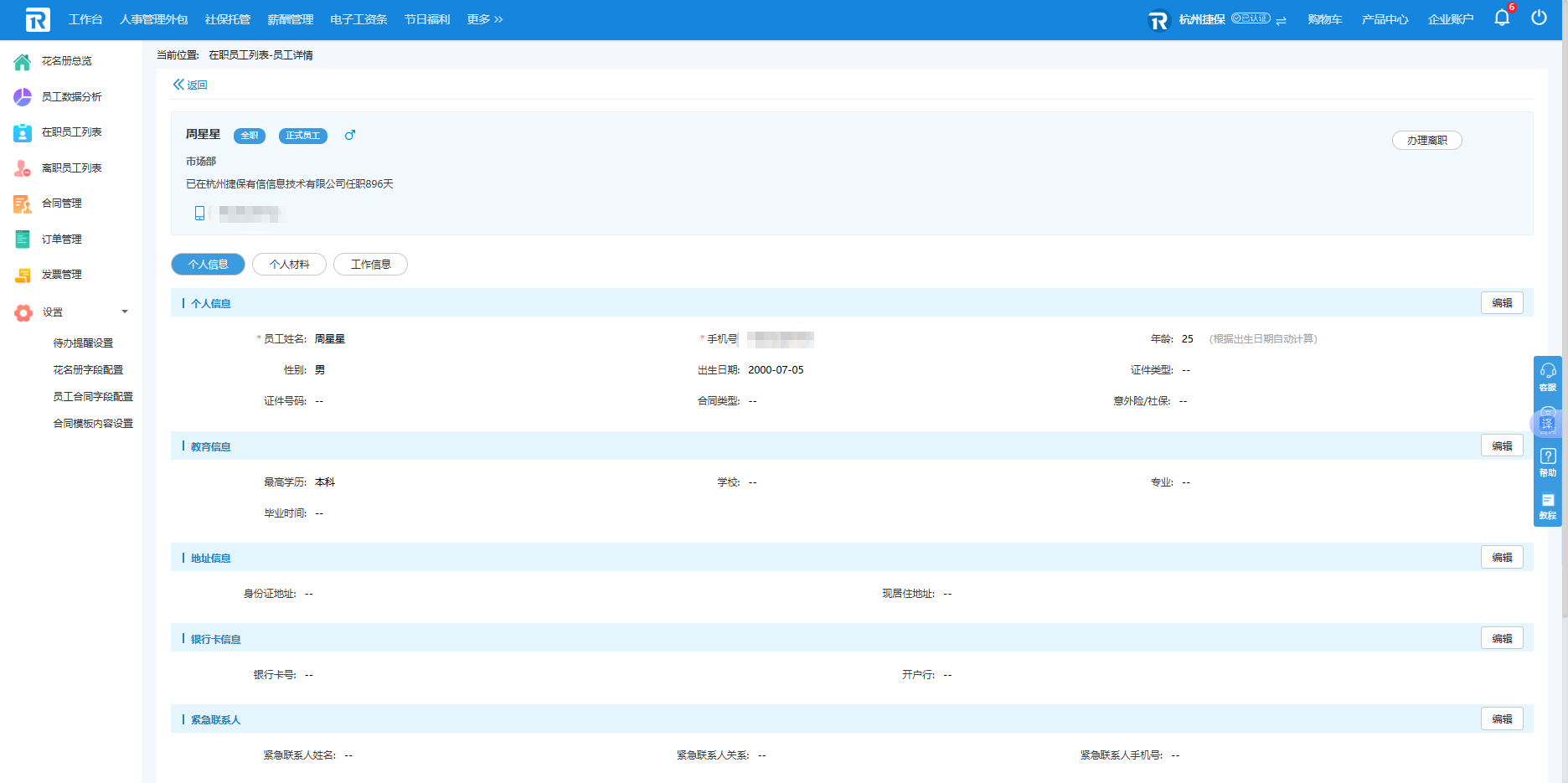 在员工详情中点击个人信息/个人材料/工作信息,即可切换查看和编辑员工的相关信息。