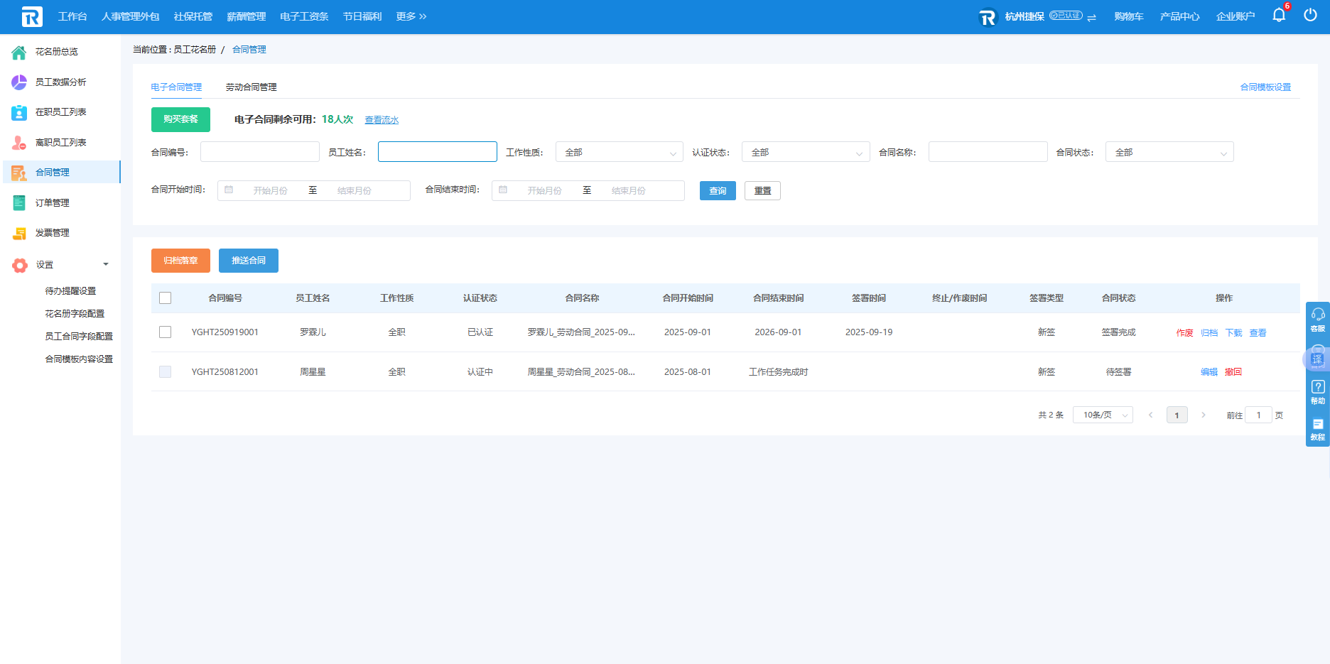合同管理包含电子合同管理和劳动合同管理两大类目,电子合同管理展示公司目前电子合同剩余可用人次以及电子合同生效中的员工列表,企业可对已签署完成的电子合同进行归档,待签署的电子合同支持撤回和编辑。