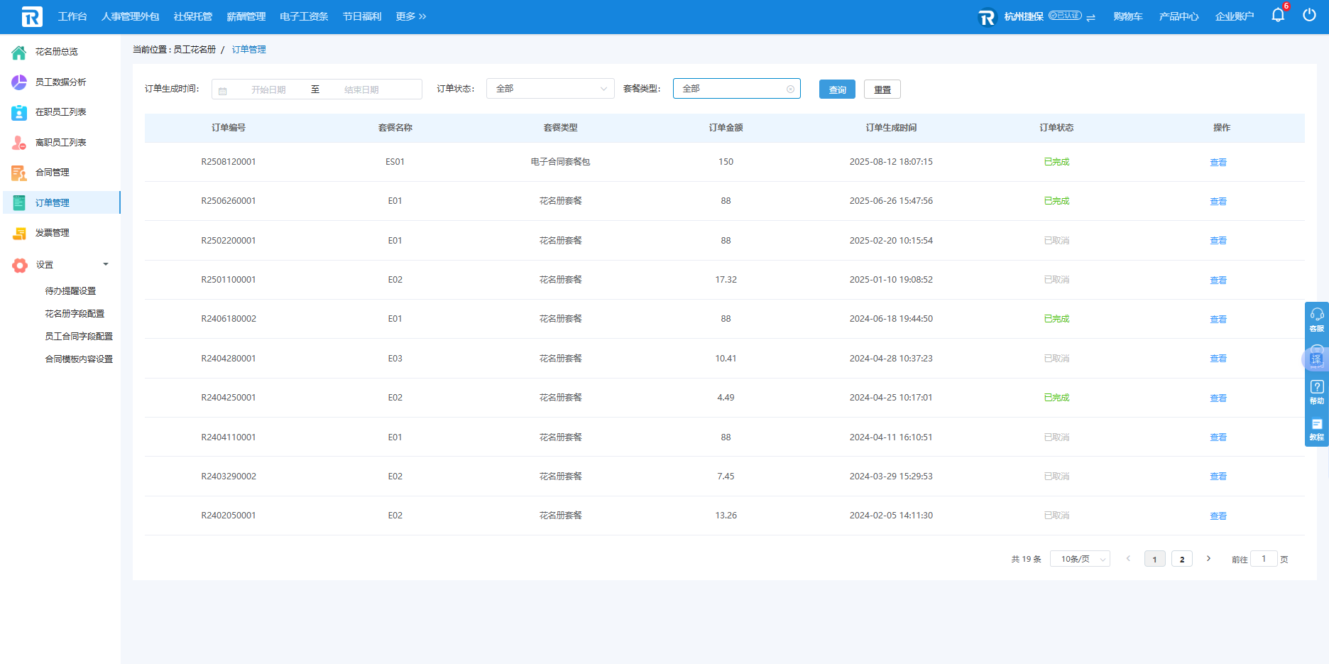 订单管理页面展示企业所有电子合同套餐包和花名册套餐订单列表,点击可查看订单详情。