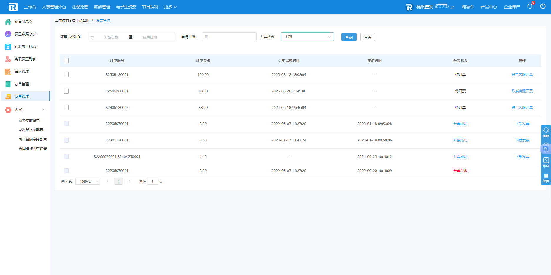 发票管理页面展示企业所有订单的订单金额、完成时间、开票状态等信息,可下载发票和联系客服给未开票订单开票。