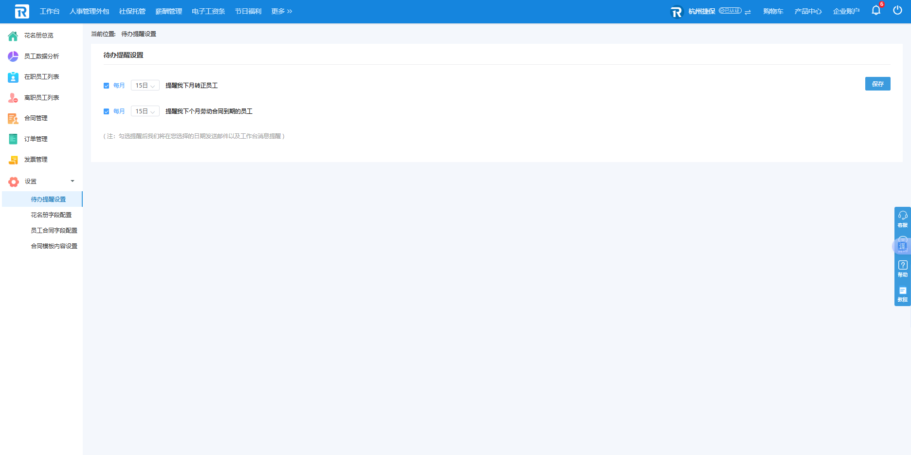 壹人事员工花名册设置有重要节点提醒的贴心功能:默认情况下平台将在每月15日为用户发送邮件,提醒HR及时于下月合同到期的员工进行续签劳动合同。当然用户可以在【设置-待办提醒设置】中自行设置提醒时间,并且支持批量发送合同续约提醒。