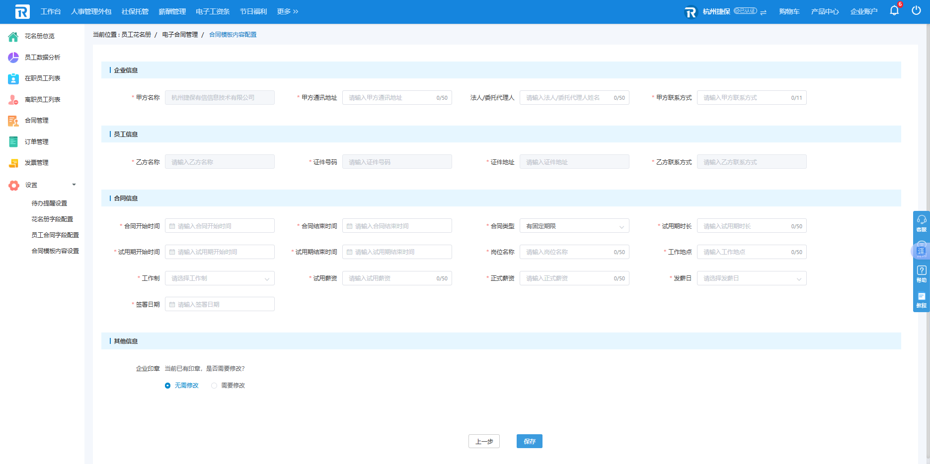 展示所有该企业可见的合同模板,可在此页面对企业信息以及合同信息进行配置,其中灰色内容为固定字段,用户无法自定义配置。