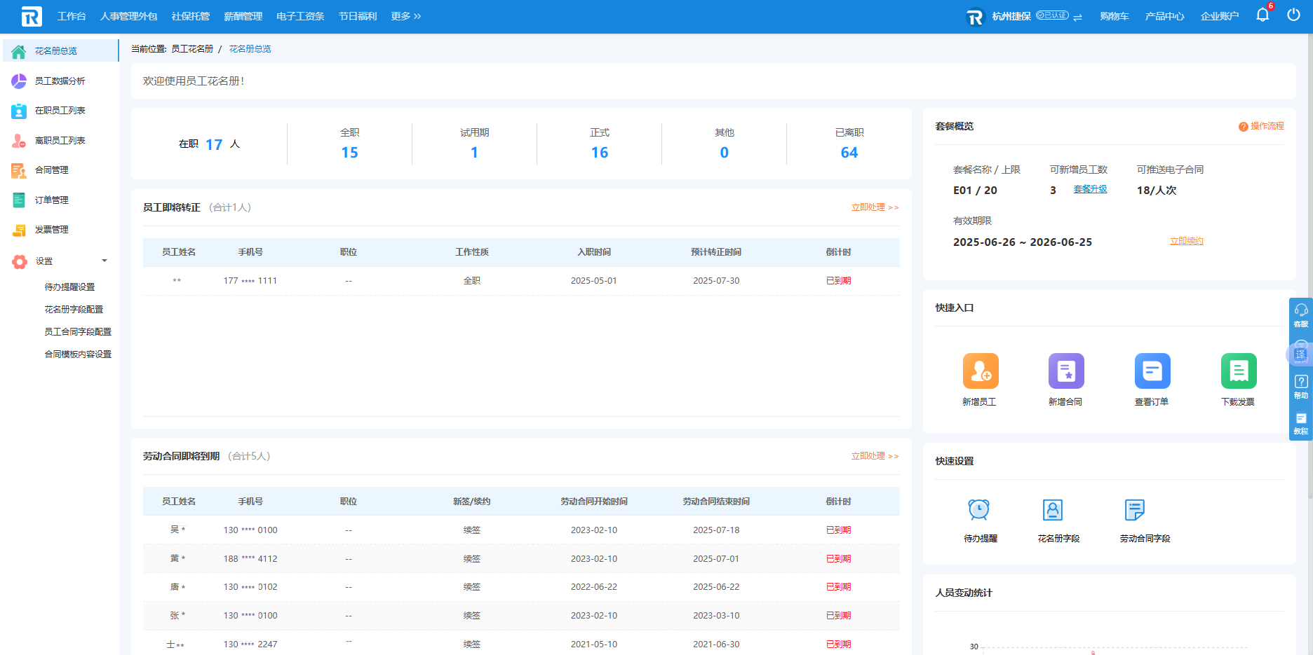 花名册总览页面展示当前公司在职及离职员工人数,包括正式员工、试用期员工、全职员工和其他类型员工人数,同时展示即将转正与劳动合同即将到期的员工列表,方便HR立即处理员工转正以及劳动合同的到期、续签相关工作。