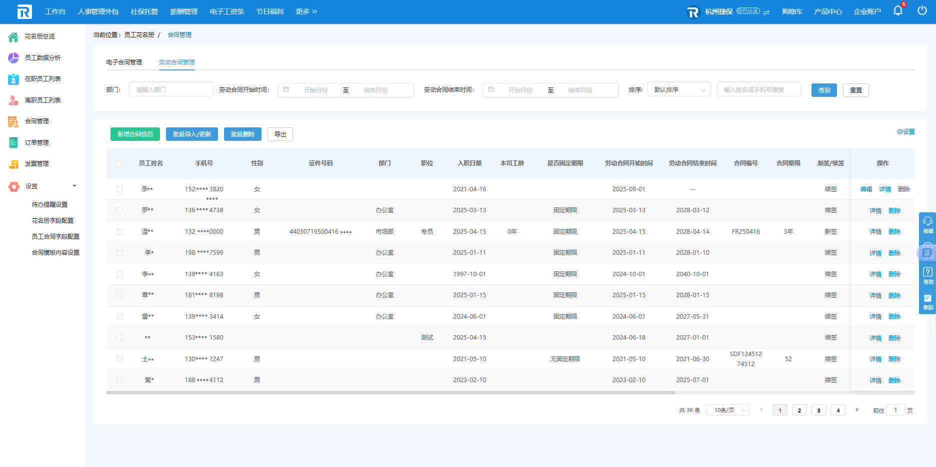 劳动合同管理页面支持企业对所有员工的劳动合同查询、编辑、办理、添加、删除等基本操作。与员工在职信息列表同理,在导入的劳动合同台帐中,模板不要修改表头,同时需要按照模板中的格式要求填写,否则可能造成上传失败。查询员工劳动合同台帐时,姓名与电话号码支持模糊搜索。