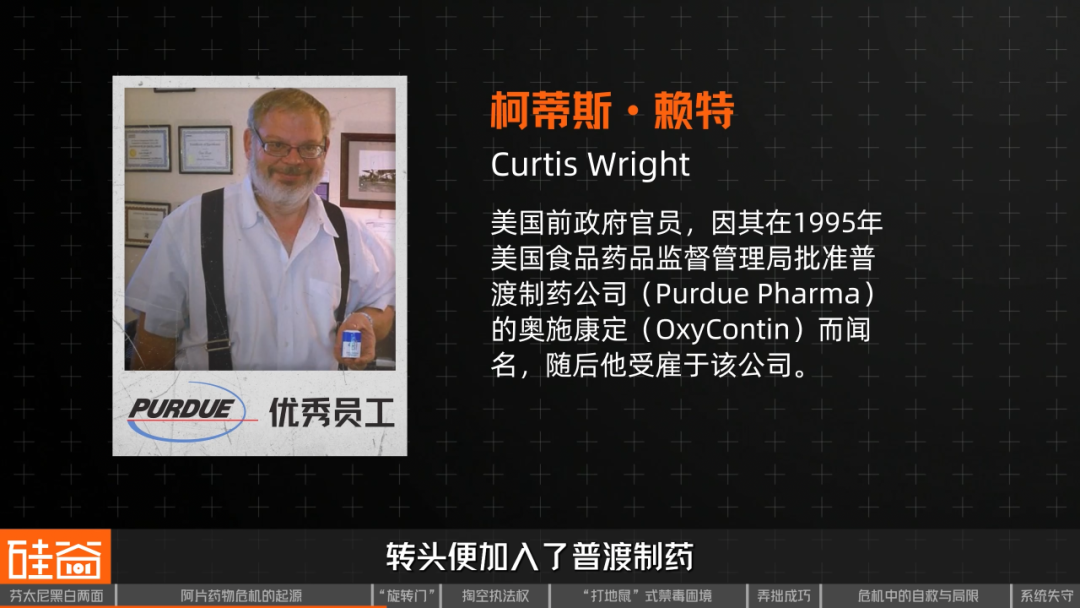 1995年底,FDA批准了普渡制药的奥施康定上市。当年审批奥施康定的FDA官员柯蒂斯·赖特(Dr. Curtis Wright),在药物获批后一年便转头离开FDA加入普渡制药,年薪高达40万美元,与在FDA的工资相比涨幅高达300%。