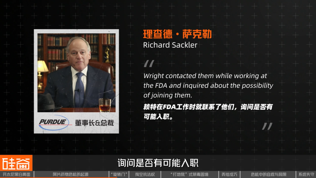 实际上,普渡制药公司的前董事长兼总裁理查德·萨克勒(Richard Sackler)在一次审判时就作证,“赖特在FDA工作时就联系了他们,询问是否有可能入职。”
