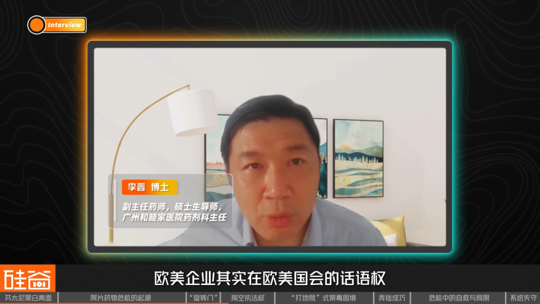 李晋博士:欧美企业在欧美国会的话语权是很强的,比如礼来,不是说礼来公司不好,因为礼来的市值能达到8000多亿(美金),它有足够的话语权在某些方面来动员国会,(使得)在某些议案方面有利于企业本身的产品的销售。不一定是(只)针对阿片类(药物)。有一些企业,比如说普渡制药,它针对自己生产的这些止痛药,它会想办法撬开一个角,让自己的药品多销售出去。