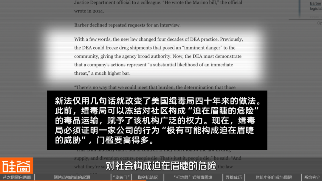 然而Marino法案修改了相关标准:此前,DEA只需认定某批药物运输“对社区构成迫在眉睫的危险”,便可立即叫停该批次发货,拥有较大的执法权限。