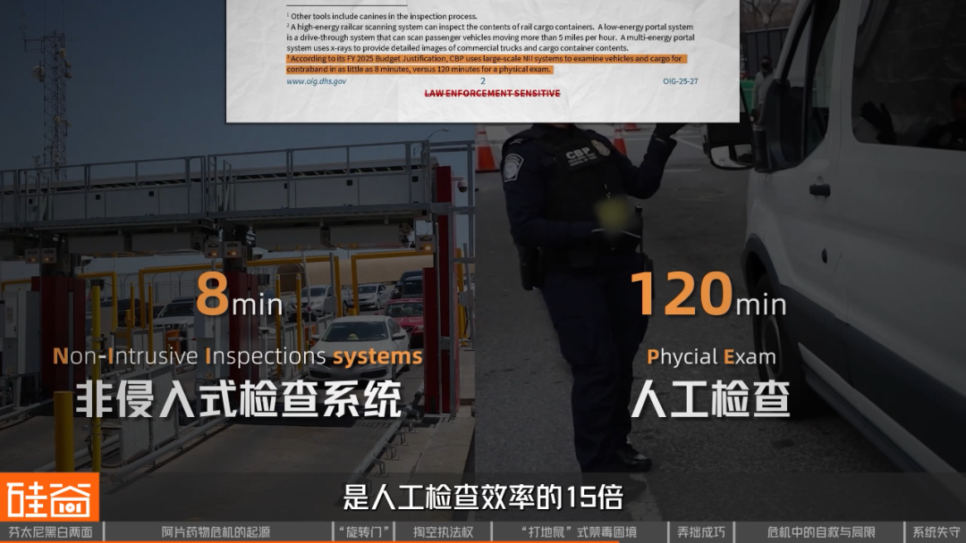 为了提升效率,美国海关在边境口岸部署了几百套非侵入式检查系统(NII systems)。这类设备通过X射线或伽马射线扫描来检测车辆、集装箱和包裹中隐藏的毒品、武器等违禁品,最快仅需8分钟,是人工检查效率的15倍。