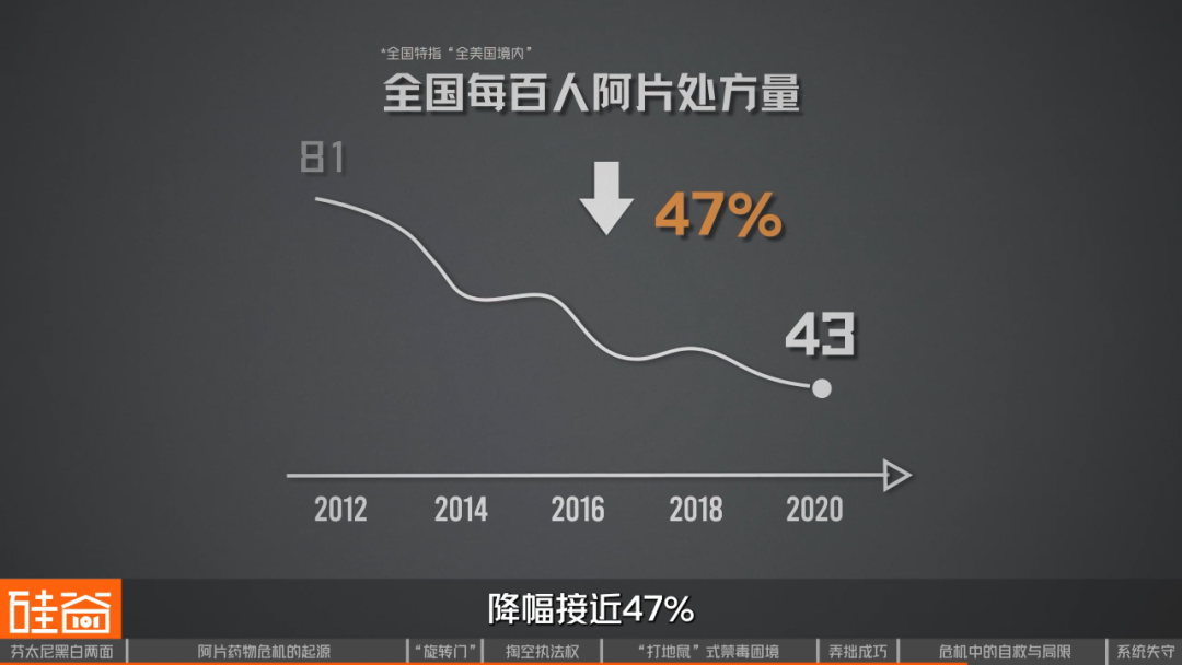 2010年前后,美国政府开始严格管控处方阿片类药物,医生开止痛药的“阀门”被迅速拧紧。全国每百人对应的阿片处方量从2012年高峰时的约81份骤降至2020年的43份左右,降幅接近47%。