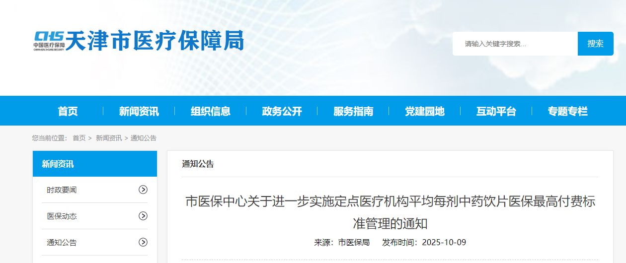 10月9日,天津市医保局网站发布《市医保中心关于进一步实施定点医疗机构平均每剂中药饮片医保最高付费标准管理的通知》,本通知自2025年10月1日起施行,明确了定点医疗机构各支付类别平均每剂中药饮片最高医保付费标准。