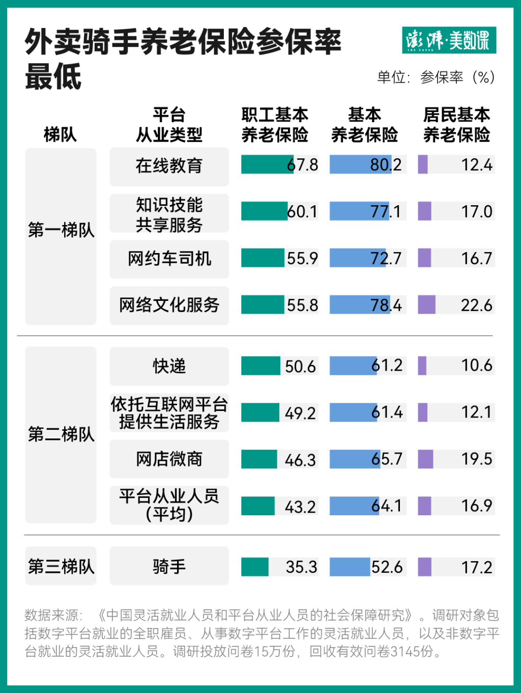 2022年,由人社部和国际劳工组织牵头,中国劳动和社会保障科学研究院撰写的《中国灵活就业人员和平台从业人员的社会保障研究》(下称灵活就业社保调研)指出,在各类灵活就业和平台从业人员中,骑手的养老保险参保率属于第三梯队。
