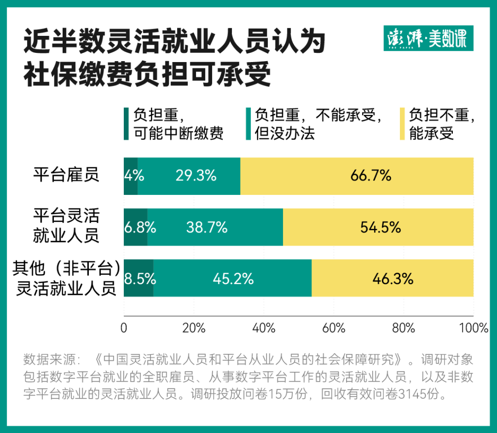 灵活就业社保调研显示,近67%的平台雇员认为社会保险缴费负担是可以承受的。报告指出,“由于个人需承担全部费率缴费,几乎一半的受访平台灵活就业人员认为社会保险缴费是一个沉重的负担”。
