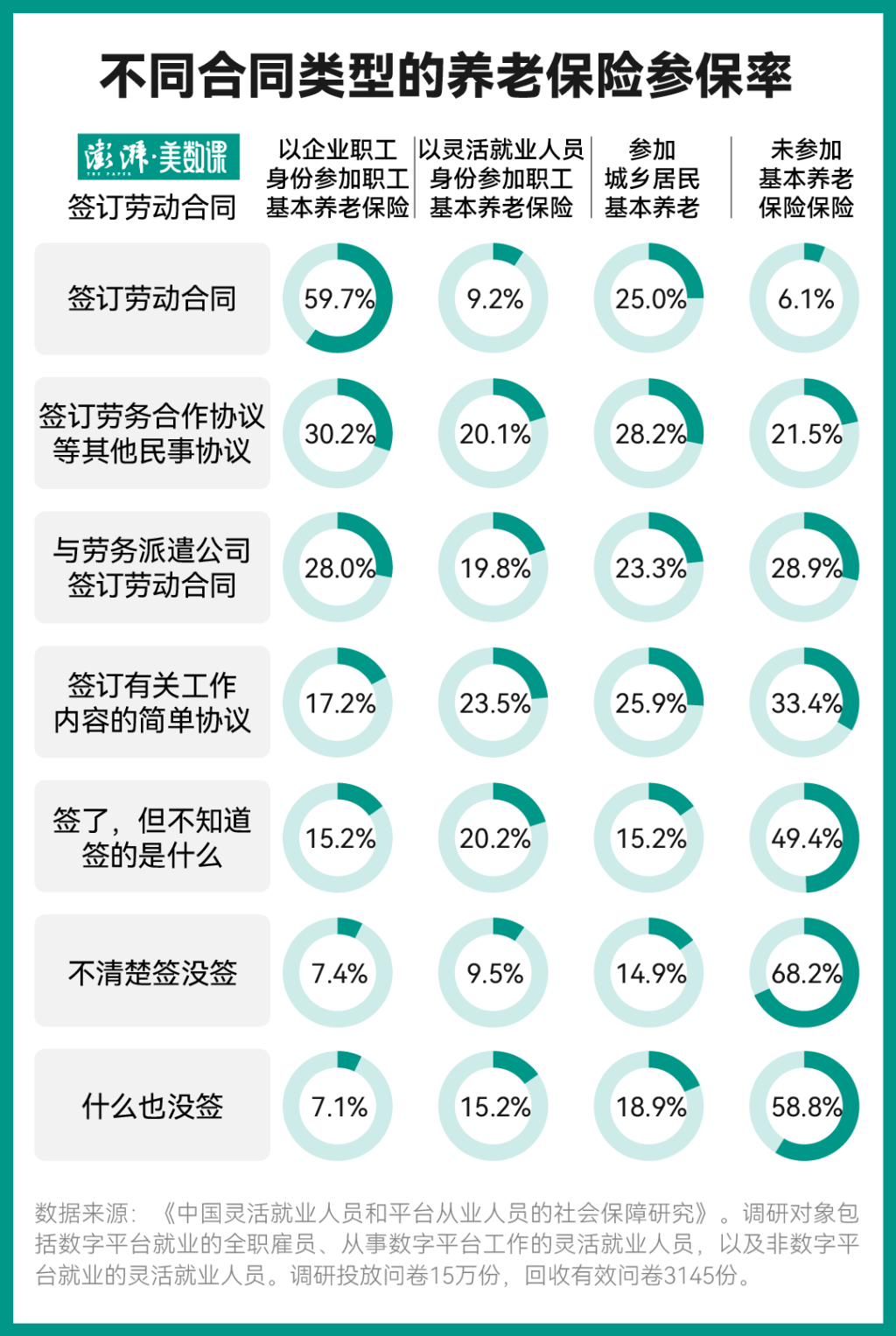 数据显示,22.6%的灵活就业企业职工不清楚签的是什么合同或是否签了合同,有7.1%的灵活就业企业员工没有签合同。灵活就业人员与企业的劳动关系越模糊,未参加基本养老保险的比例越高。