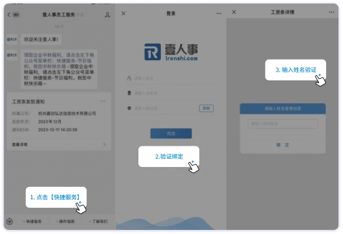 第四步:员工接收工资条。关注【壹人事员工服务】公众号,公众号菜单栏→快捷服务→我的工资条,输入姓名验证,即可查看工资条详情。员工查收之后,确认信息无误后,可手写签名确认!